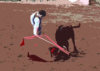 A caminho do centro da arena, o coração resolve acalmar e pulsar com temple. Estranho! Parece que tudo à volta parou. Ao longe, a voz do Mestre José Júlio corrigindo a colocação. No centro, apenas quem ia debutar, uma muleta na mão direita e aquela gigante com pouco mais de um metro de altura. Com o abanar da flanela vermelha ela avançou e a mão foi conduzindo a sua investida. Tudo parecia mágico. Tudo não! Os olhos pararam e não seguiram a viagem. Grande erro! Ainda não terminara o primeiro Derechazo e já havia a primeira voltareta. “Levanta-te e vai lá outra vez!” Palavras de incentivo do Mestre, histórico Matador português. Agora seria diferente. A calma mantinha-se e a mente clareou. Quatro ou cinco Derechazos rematados com Passe de Peito. Estava ganha a tarde! Terminou a Faena que não o foi para quem assistiu, mas que marcou de forma triunfante quem a executou.